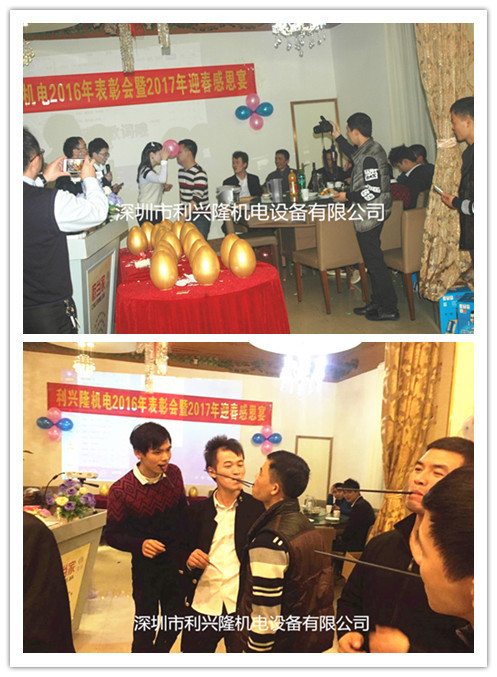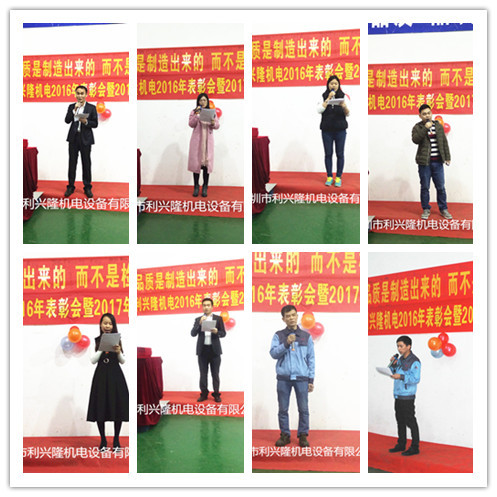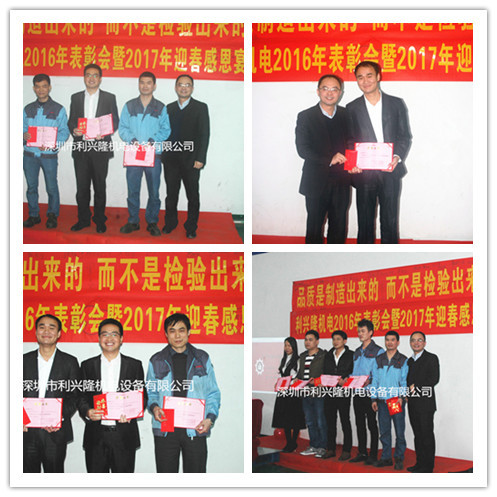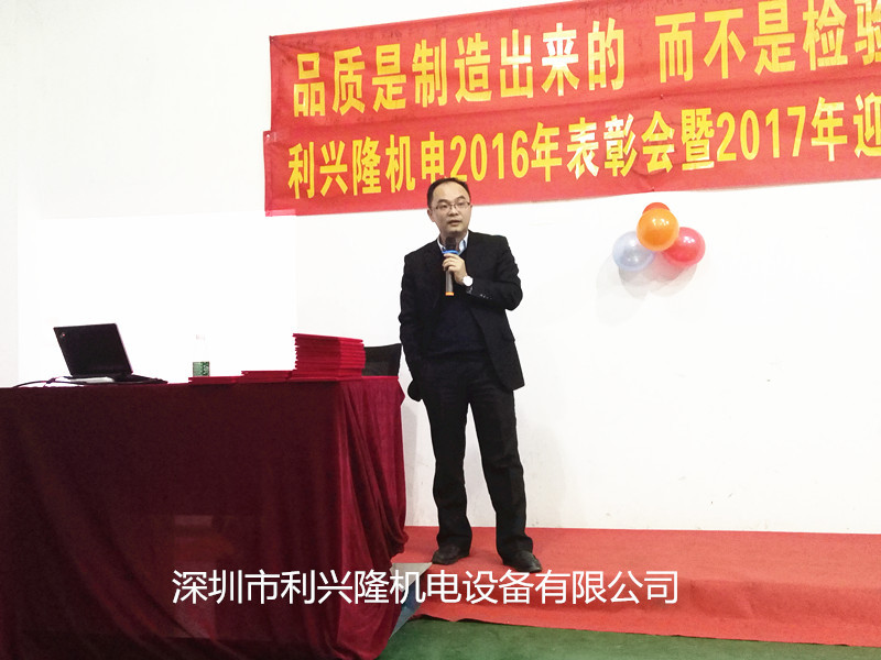 “回顧2016年,展望2017年”,利興隆機電于2017年1月14日舉辦“2016年表彰會暨2017年感恩宴”;在2016年里我們一家人為目標(biāo)努力奮斗前行,感謝智睿的工程師、帥氣的業(yè)務(wù)員、勤肯的生產(chǎn)師傅們你們?yōu)楣镜慕ㄔO(shè)添瓦加磚。當(dāng)天公司給員工頒發(fā)了各項獎項,有“青春貢獻獎”、“優(yōu)秀員工獎”、“銷售冠軍獎”、“質(zhì)量標(biāo)兵獎” 、“最佳新人獎” 等等,公司各部門負責(zé)人也對2016年各自部門的工作做了總結(jié)并對2017年做了全面的計劃;最后陳總上臺對2016年公司所取得的成績做了完美的總結(jié);描繪2017年的宏偉藍圖,對公司全體員工的努力給予了充分肯定,陳總說:2017年我們每一位員工與利興隆攜手創(chuàng)造新高度!新輝煌!